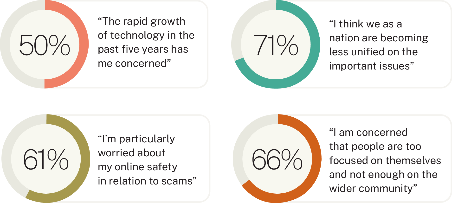 The rapid growth of tech, and online safety in relation to scams has a number of people concerned. There are also worries about unity and sense of community.